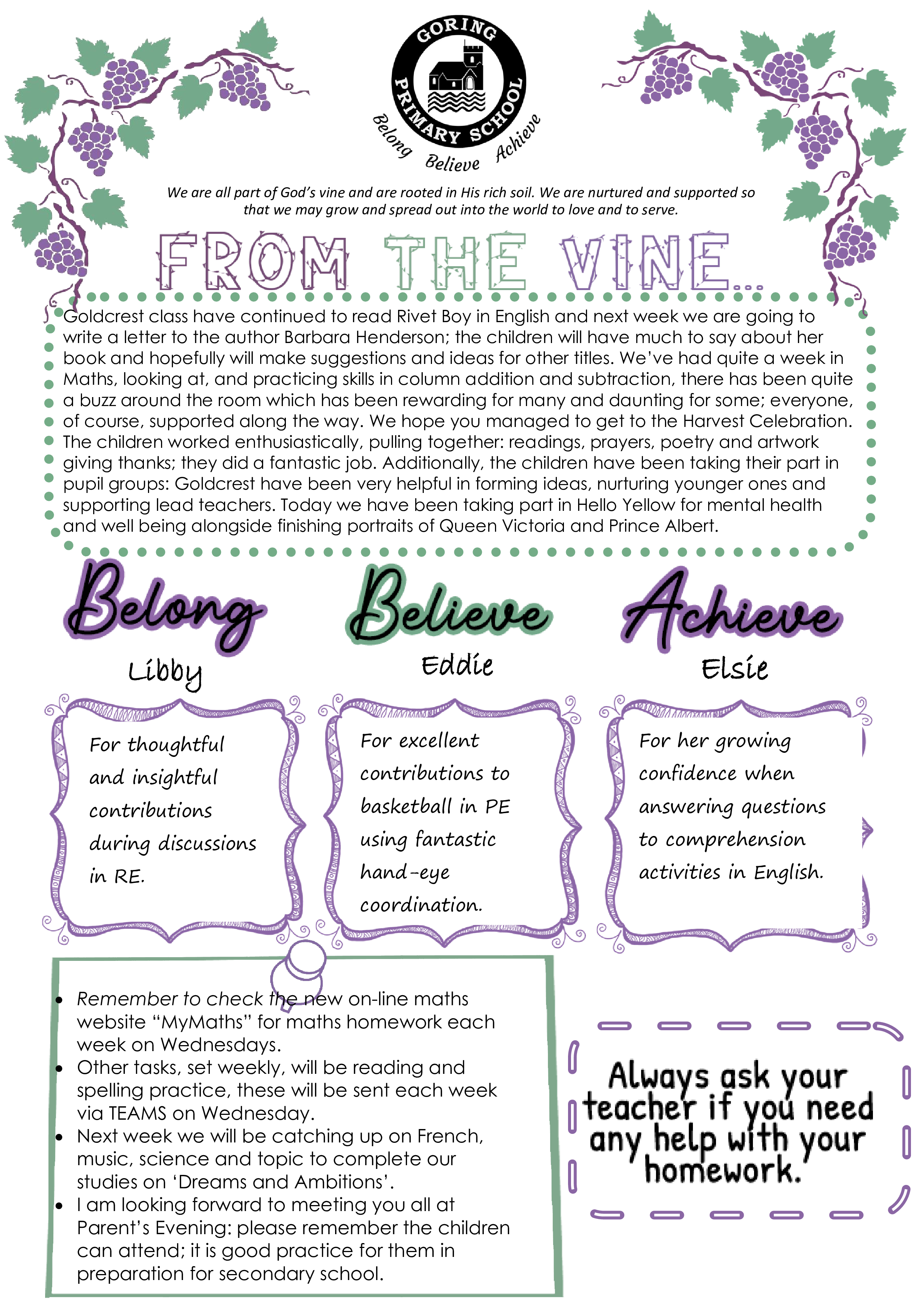 Welcome to Goldcrest class. Here is our newsletter showing all the exciting things we have been doing this week. Here are our medium and long term plans.